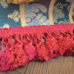 Detta är en vacker, vinröd, virkad spetskant. Den har en vågig design och kan användas för att dekorera kläder, heminredning eller andra hantverksprojekt.