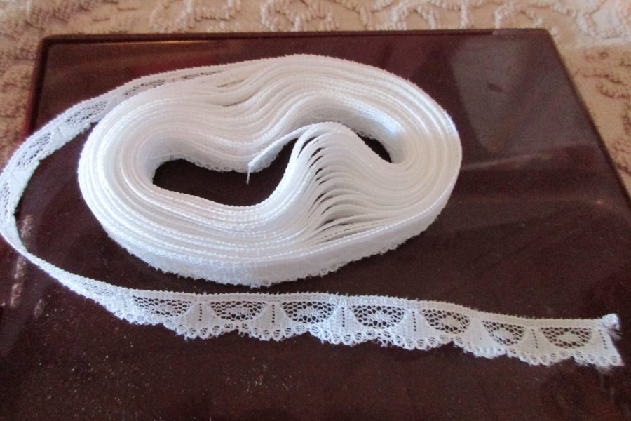 Vit spets, Spetsen har ett mönster med små hål och vågiga kanter.5 meter 1 cm bred
