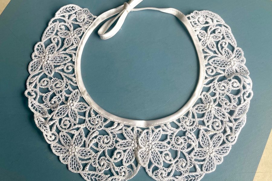 Vit spetskrage med blommönster och knytband. Kragen har en detaljerad design med utskurna blommor och blad. Knytbandet är i ett slätt, vitt tyg som matchar spetsen.