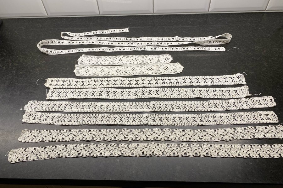 Handvirkade spetsar enl bild. Aldrig varit monterade eller använda, bara legat i en påse i ett skåp!!