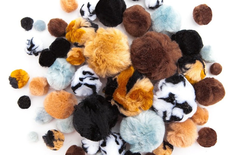 56 stycken fluffiga och extra mjuka pompoms i fyra olika storlekar i bruna, grå, vita och svarta nyanser.