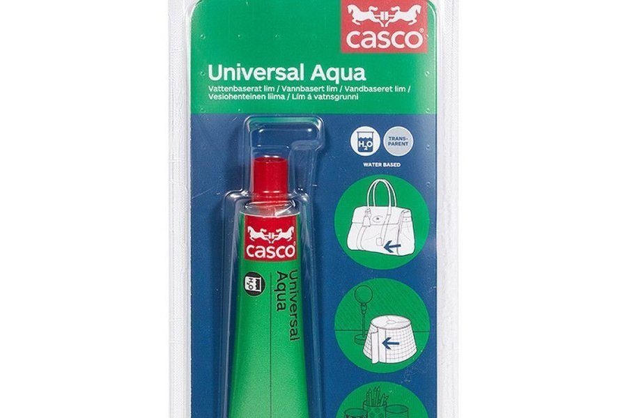 Casco Universal Aqua är ett vattenbaserat allroundlim för trä, papp, textil, läder, kork. Limmar även ovanstående material mot glas, keramik, metall och plast. Klar limfog. Limma på rengjorda och torra ytor. Stryk tunt med lim på ena ytan och låt limmet suga in. Pressa samman. Belasta inte limfogen förrän efter ett dygn. Ej intorkat lim kan tas bort med vatten.