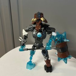En Bionicle figur med tillhörande vapen. Figuren har blå och silverfärgade detaljer.