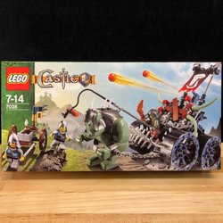 Engelsk produktbeskrivning: LEGO 7036 Dwarves' Mine is a 575 piece Castle set with 7 minifigs released in 2007. It consists of a mine with a rolling cart, wheel-operated bucket, catapult, 4 dwarves, 2 troll warriors, a giant troll, and mining tools.