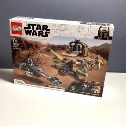Lego Star Wars set med rymdskepp och tillhörande figurer. Inkluderar karaktärer som Rey, Stormtrooper, Sandfolk, Baby-Yoda, Mandalorian, BB-8 och andra.
