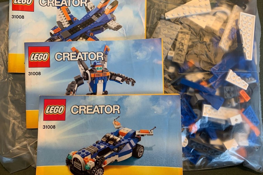 Lego Creator set 31008 med instruktionsböcker. Bitarna är nedpackade i en påse.