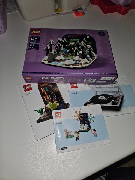 Lego set innehållande Northern Lights Diorama (40785), Bookstore (40698), Fireworks Celebration (40689) och Retro Turntable (40699). Norther Lights Diorama i oöppnad kartong övriga byggda en gång och aldrig lekta med.