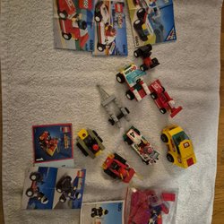 Fem Lego bilar i olika färger och modeller. Bilarna är byggda med legobitar och har rörliga hjul. Varje bil har en legofigur som förare. Bilarna inkluderar en röd jeep, en vit rallybil med Shell-logotyp, en gul bärgningsbil, en vit polisbil och en gul personbil. Finns ingen kartong eller byggbeskrivning till dom