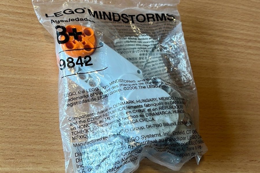 Dette er en LEGO Mindstorms-komponent, modelnummer 9842. Den er pakket i en forseglet pose. Posen er uåbnet