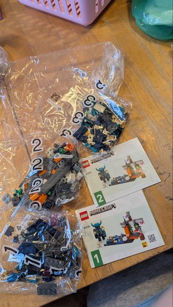 LEGO Minecraft set 21274. Innehåller instruktionshäften 1 och 2 samt påsar med legobitar märkta 1, 2 och 3.