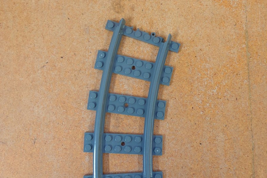 En böjd LEGO tågräls i grått. Rälsen har standard LEGO-anslutningar för att enkelt kunna byggas ihop med andra LEGO tågbanor. Den är kompatibel med de flesta LEGO tågset.