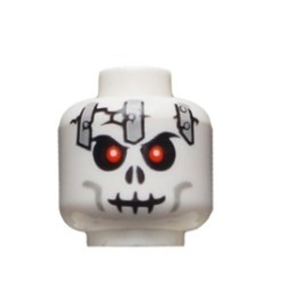 Minifigure, Head Skull Red Eyes, Black Cracks, Light Bluish Gray Metal Plates and Cheek Lines, Evil Grin Pattern