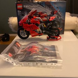 LEGO Technic Ducati Panigale V4 R modell. Inkluderar motorcykeln och tillhörande stöd.