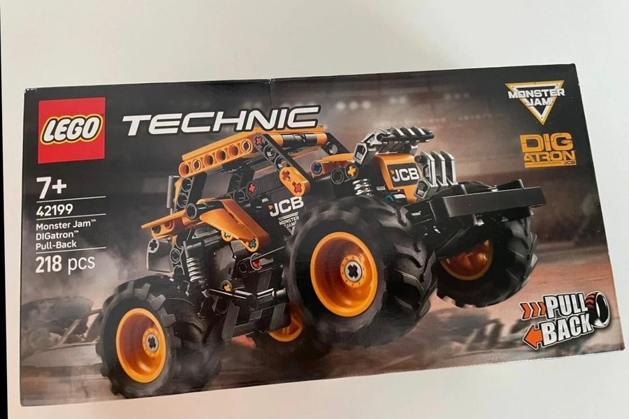 LEGO Technic Monster Jam DIGatron Pull-Back, modellnummer 42199. Byggsatsen innehåller 218 delar och är lämplig för åldrar 7+. Modellen är en JCB-märkt monstertruck med pull-back-funktion.