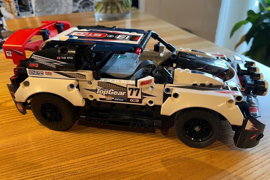 LEGO Technic Top Gear Rallybil med detaljer som "The Stig" och nummer 77. Modellen har en röd vinge baktill och svarta hjul. Den är vit, svart och röd med Top Gear-logotypen. Ett par bitar saknas.