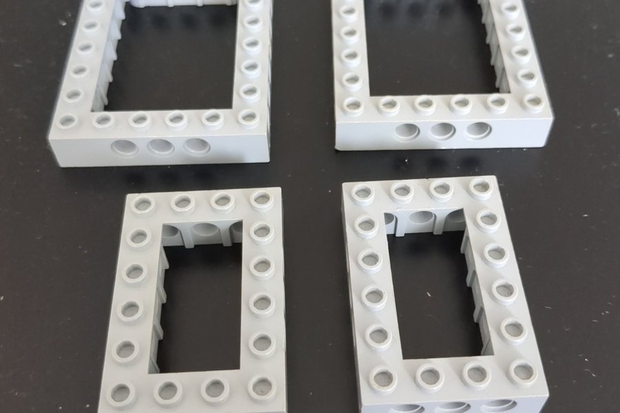 Fyra stycken LEGO Technic ramar i ljusgrått. Två stycken 6×8 och två stycken 4×6.