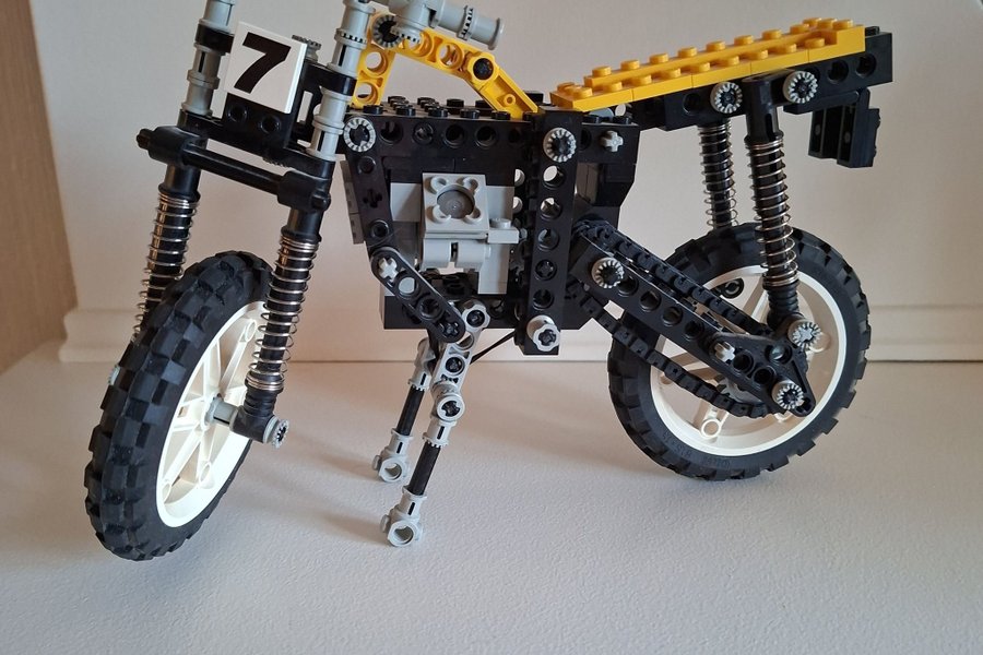Byggd LEGO Technic motorcykel. Modellen har fungerande fjädring fram och bak, samt en kedjedrift till bakhjulet. Stödet kan fällas ut för att stå stadigt.