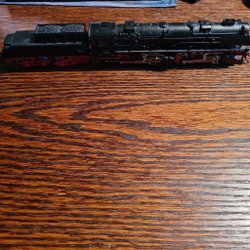Svart modell av ett ånglok med röda detaljer. Loket är i plast och utan motor, en fin modell att ha som statist vid ett lokstall eller liknande.