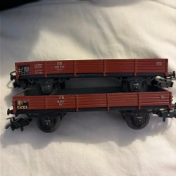 Två Märklin vagnar i skala H0. En vädrad vagn med två lådor, limmade, och en vagn med slipers, lösa.