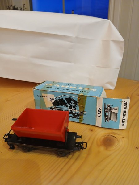 Märklin tippvagn 4513. Vagnen är svart med en röd tippbehållare. Förpackningen är blå och vit med texten "Märklin Tipping Truck" och "Kippwagen".