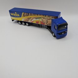 Märklin(?) HO. Kranvagnen är blå och grå med svarta detaljer. Den har en rörlig kranarm med kedjor och krokar. Vagnen har åtta hjulaxlar.