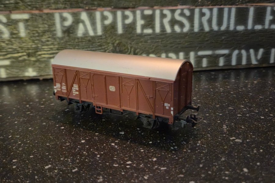 Modelltågsvagn i brunt med silverfärgat tak. Vagnen har texten "DB" på sidan.