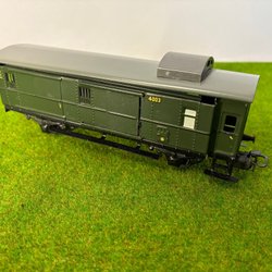 En modelljärnvägsvagn i grön färg. Perfekt för din modelljärnväg. Dörr på sidorna saknas missfärgning på delar av taket annars ok