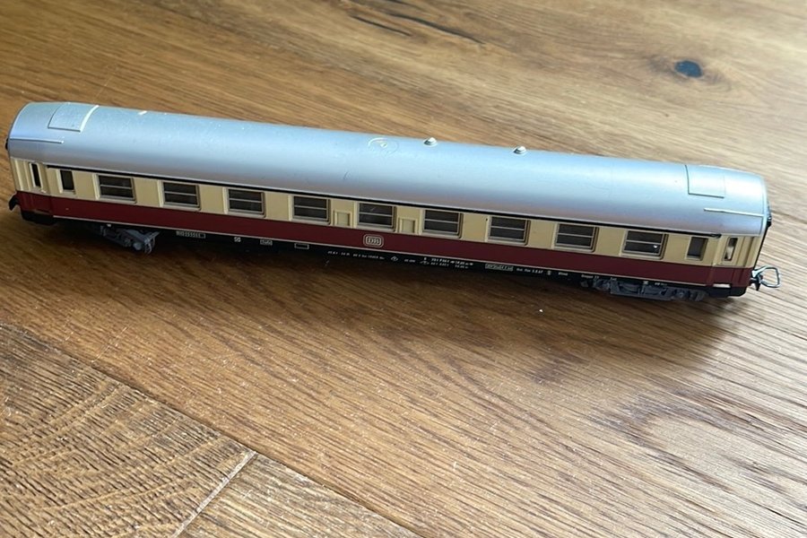 Modelltågsvagn i skala H0. Vagnen är märkt med ”DB”-logotypen och har detaljerade fönster och underrede.