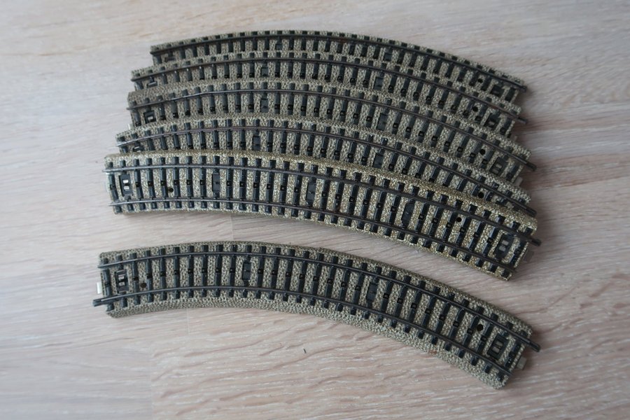 Ett set med modelljärnvägsräls. Innehåller 6 böjda skenor, ca 22 cm långa.