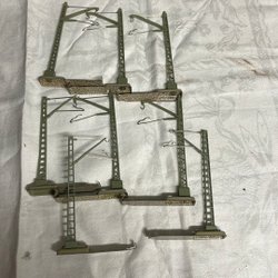 Ett parti modelljärnväg med räls, vagnar och ett lok, vet inte om det är Märklin. Innehåller även en bro. För den som kan fixa, två vagnar har tappat ett hjulpar, som finns med. Samma med vagnen med gult galler som ska vara på underredet.