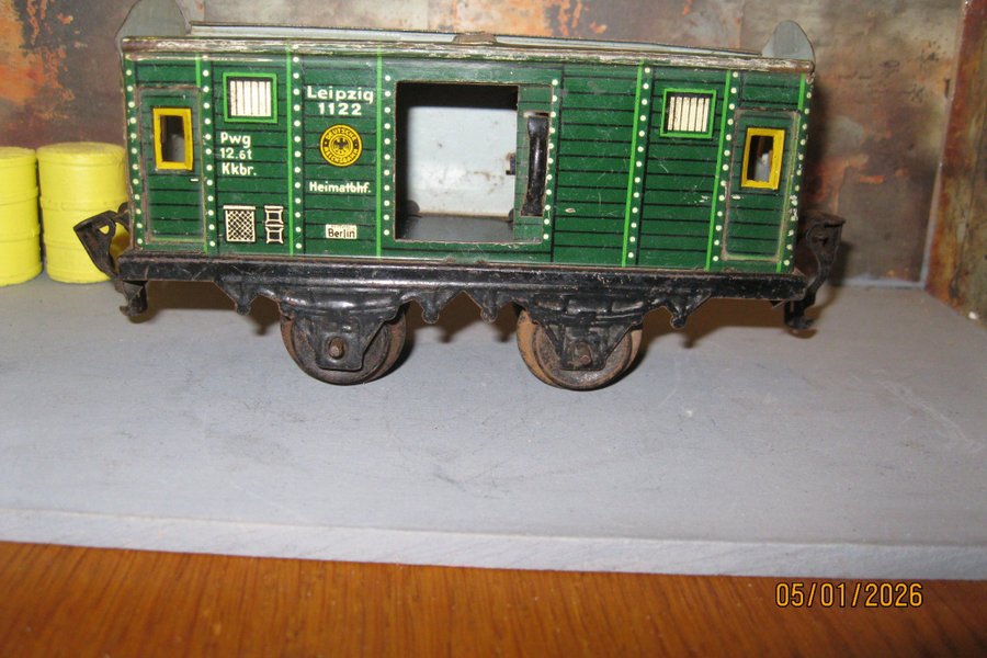 Gammel legetøjs togvogn. Grøn vogn med påskriften Leipzig 1122, Pwg 12.6t Kkbr, Heimatbhf Berlin.