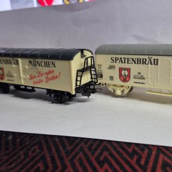 Två modelltågsvagnar. En vit vagn med texten "Fürstenberg Pilsner" och en grön vagn med texten "Ringnesbacher".