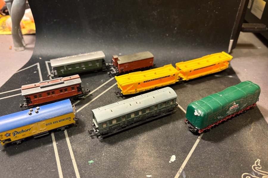 Detta är ett parti med modelltågsvagnar. Partiet innehåller sju vagnar av olika typer och färger. En av vagnarna är en blå och gul ölvagn med texten "Pschorr Bier aus München". En annan vagn är grön med texten "Schultheiss Berliner Weisse". Två av vagnarna är gula transportvagnar märkta "Skandiatransport". En vagn är röd och en annan är grön med grått tak. Den sista vagnen är rödbrun.