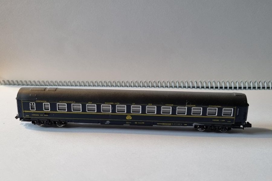 Modelltågsvagn i mörkblått med gula detaljer och texten "Compagnie Internationale des Wagons-Lits et des Grands Express Européens" på sidan.