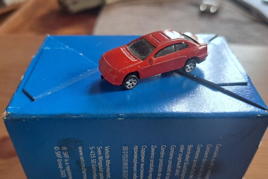 En röd leksaksbil. Bilen har svarta fönster och silverfärgade fälgar. Den står på en blå låda.