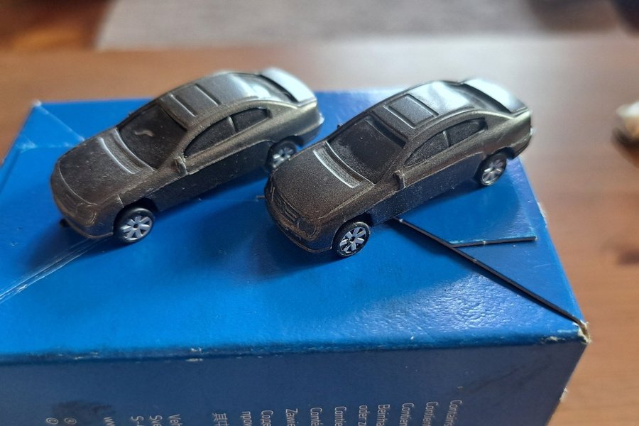 Två små leksaksbilar . Bilarna är gråa och har svarta detaljer. De har små hjul med silverfälgar. Bilarna är av samma modell.