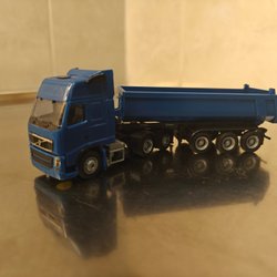 Lastbil med tvåaxlat släp. Bilen har dubbla axlar bak med vardera två hjul. Släpet är av typen påhängssläp. Mycket fint skick.