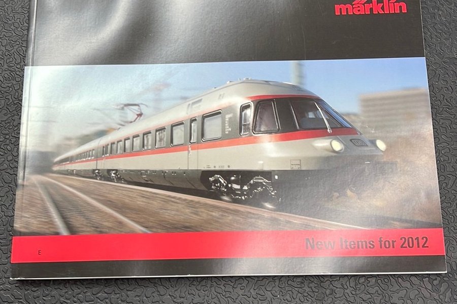 Katalog från Märklin med nya produkter för 2012. Framsidan visar ett tåg i grått och rött.