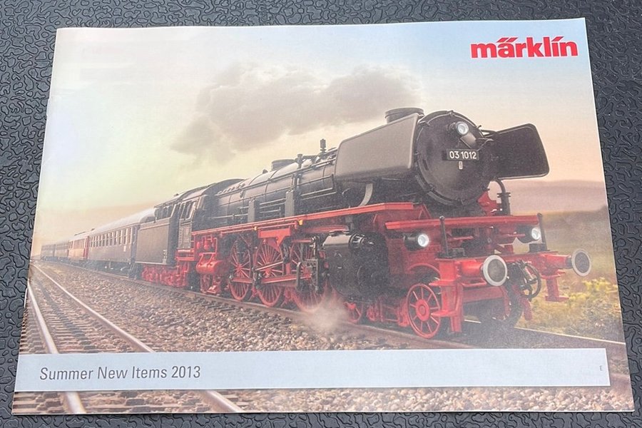 Katalog från Märklin med nya artiklar för sommaren 2013, med fokus på modelljärnvägar och tillbehör.