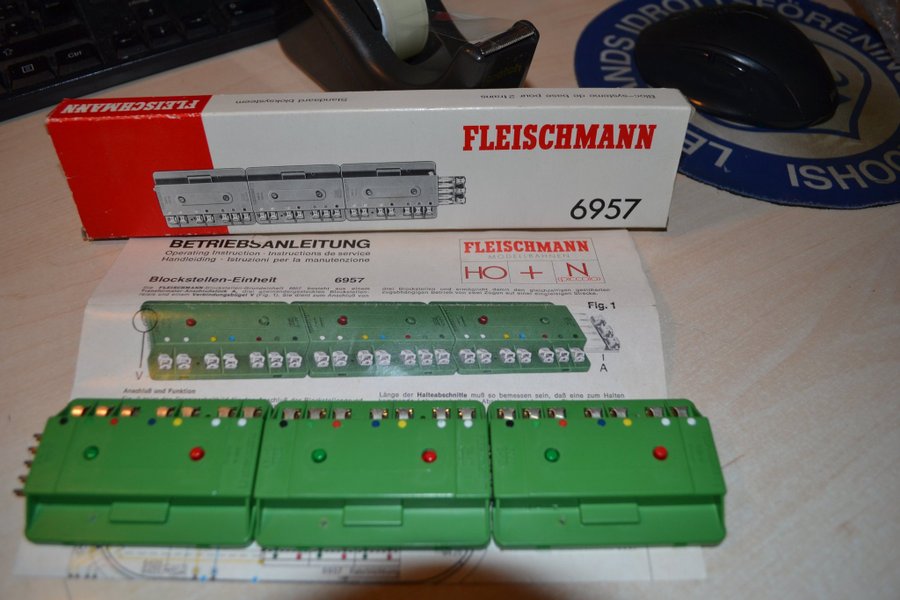 Fleischmann 6957 blockenhet med originalkartong och instruktioner. Avsedd för modelljärnväg. Tillverkad i Tyskland.