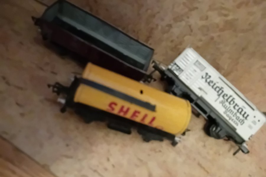Detta set innehåller tre modelltågsvagnar. En gul Shell tankvagn, en vit Reichelbräu godsvagn och en öppen godsvagn i mörk färg.