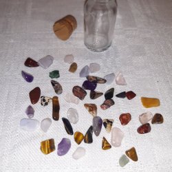 Tre ljusa stenar/kristaller. Stenen i mitten är till hälften genomskinlig. Vet inte vad de är för ena eller vad de gör. Vikt 9-12 gram