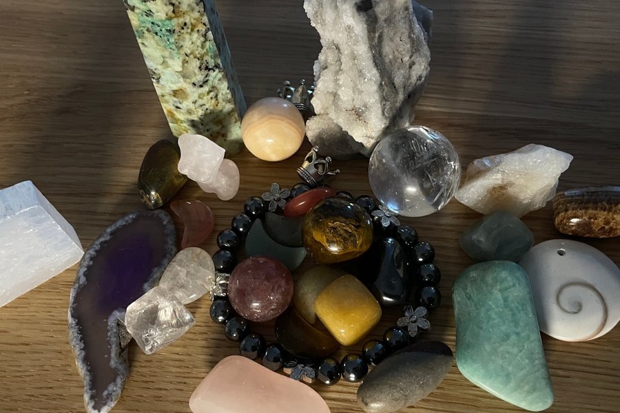 Ett sortiment av kristaller och stenar i olika former och färger. Inkluderar bland annat rosenkvarts, hematit, agat och tigeröga.