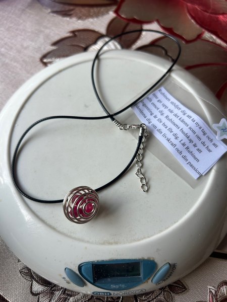 Läderimitation halsband med ett runt stålhänge som innehåller 5 små kulor av Rubin. Det runda hänget är 2cm i diameter och halsbandet (öppnat) är 45cm.