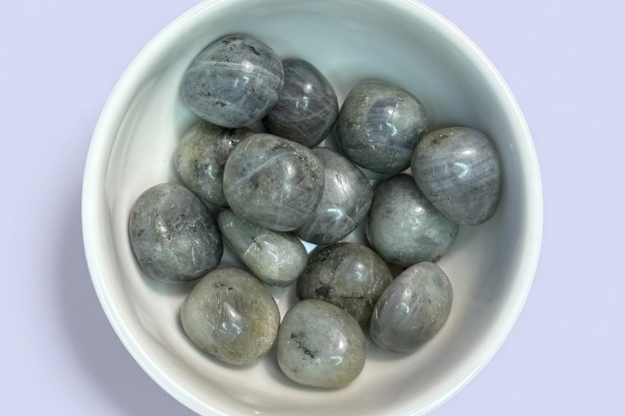 Trumlad labradorit med naturliga skiftningar som kan visa toner av blått, grönt eller guld beroende på hur ljuset faller på stenen. Varje sten har sitt eget mönster och sina egna nyanser.
