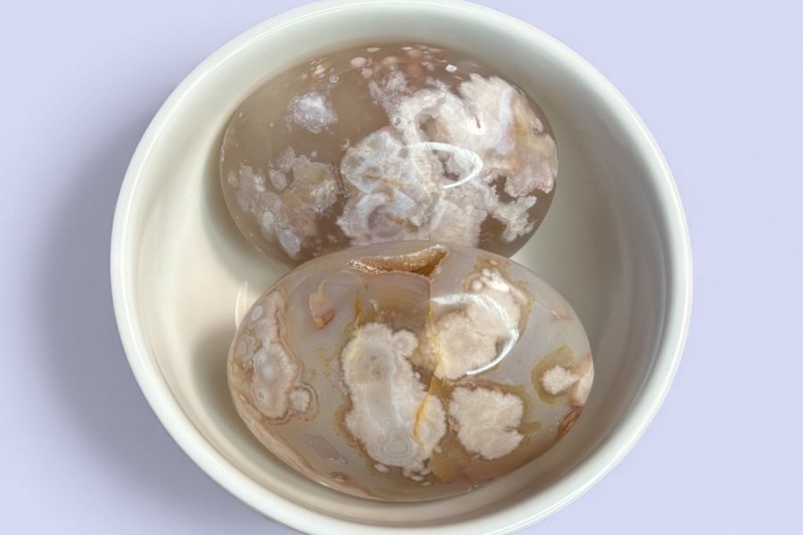 Handsten av blomsteragat med mjuka blomliknande mönster och naturliga färgvariationer.