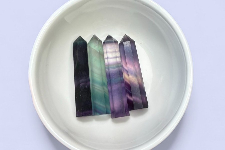 Små torn av fluorit i lila och grönblå toner med naturliga mönster. Varje torn är unikt.