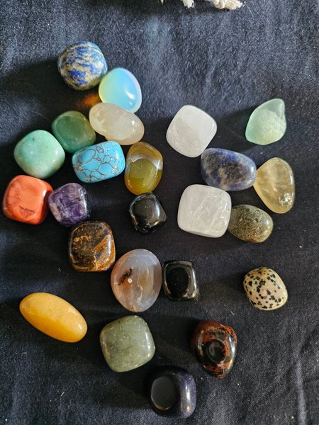 Diverse trumlade stenar, Lapis, agat, blodsten, tigeröga ametist, klar kvarts, röd obsidian, regnbågsflprit, rosenkvarts, är flera som nu ser på bilden. 24 stycken