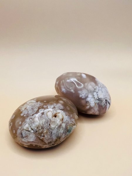 Stor blomsteragat med mjuka, naturliga formationer i dova beige- och gråtoner. De vita “blomningarna” breder ut sig organiskt över stenen och ger ett levande uttryck.