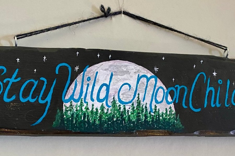 Handmålad med texten ”Stay wild moon child”. Skylten har två små öglekrokar och ett snöre för upphängning. Ca 30cm bred, 10 cm hög och 1 cm djup.